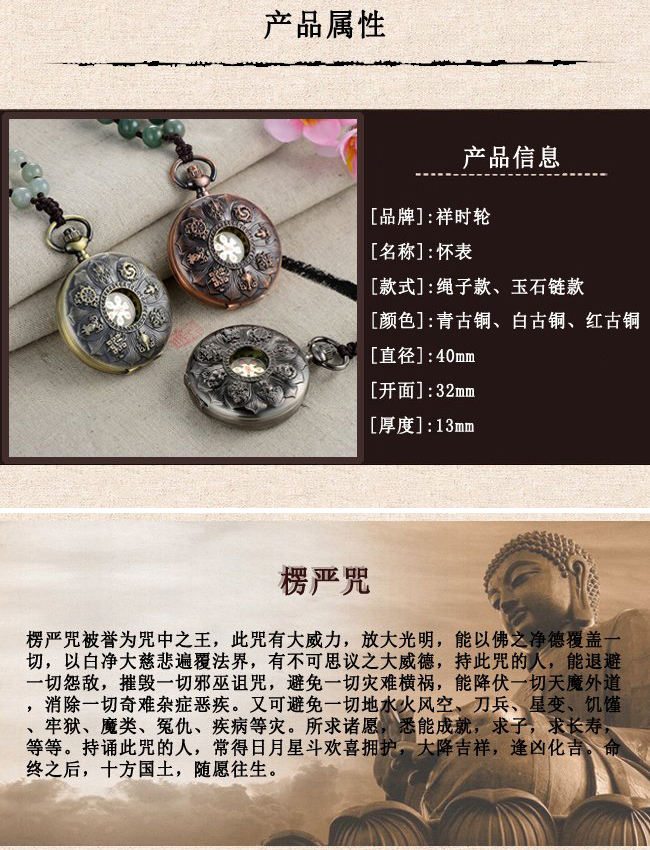 如意輪楞嚴(yán)咒佛表將楞嚴(yán)咒刻于表盤底蓋內(nèi)部,楞嚴(yán)咒,又名白傘蓋咒、如來藏心咒,分五部,表示五方。咒之用能覆一切,故叫傘蓋。在佛教里頭,《楞嚴(yán)咒》是最重要的一部咒,是咒中的王,也是咒 里邊最長的一個咒,這個咒關(guān)系著整個佛教的興衰。佩戴此佛表者,咒輪轉(zhuǎn)動,既有佛咒轉(zhuǎn)經(jīng)功德的磁場加持,增長福報,一日轉(zhuǎn)動14400次,等同念咒14400遍,保佑大家平安吉祥,積累轉(zhuǎn)經(jīng)輪的功德與意義,能退避一切怨敵,摧毀一切邪巫詛咒,避免一切災(zāi)難橫禍,能降伏一切天魔外道,消除一切奇難雜癥惡疾。