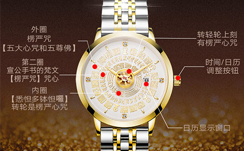 用心雕刻楞嚴咒,文法工整,字字清晰,猶如佛音在耳;佛字輪廓清晰,細節生動,宛如一本經書佩戴在手。楞嚴咒佛表精鋼表殼配上藍寶石鏡面,上手效果心性慈祥,儀態端莊,盡顯華貴!轉經筒演化而來的轉經秒盤,秒輪轉動,相當于每天誦經上萬次!楞嚴咒佛表經高僧大德加持開示,能消除宿世的業障,增長智慧,累積福報!