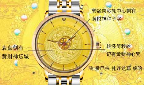 黃財神是西藏最古老佛法雍仲本教十五儀軌的其中之一,屬于密續之中的神,本波教徒作為方便修法,佛祖其美祖普和幸饒彌沃佛等人傳授了許多種財神的修行方法。其中黃財神也被藏傳佛教各大教派普遍供奉。黃財神的形象為上身袒露,下身著裙,右手持摩尼寶,象征寶光普照十方,增添眾生的福報;左手抱一只大貓鼬(吐寶鼠),鼬的嘴里含著珠寶,象征著財寶。右腳踏一只白色海螺,象征著他能入海底取寶。 黃財神奮勇現身,庇護著天下善男善女增添福報,使得眾多聞法者衣食無憂,幸福快樂,富裕安康。周邊圍繞的八種財神為部屬,協助黃財神救渡眾生,以滿眾生之愿。黃財神是位助益一切貧苦眾生的大護法神。關于黃財神的介紹,在古老象雄佛法雍仲本教的《雍智嘉納瑪》經里面講得比較詳細。《雍智嘉納瑪》翻譯過來就是(招財漢文版)的經,在這本書里黃財神心咒就是:“嗡,占巴拉,雜勒扎耶,唆哈”。