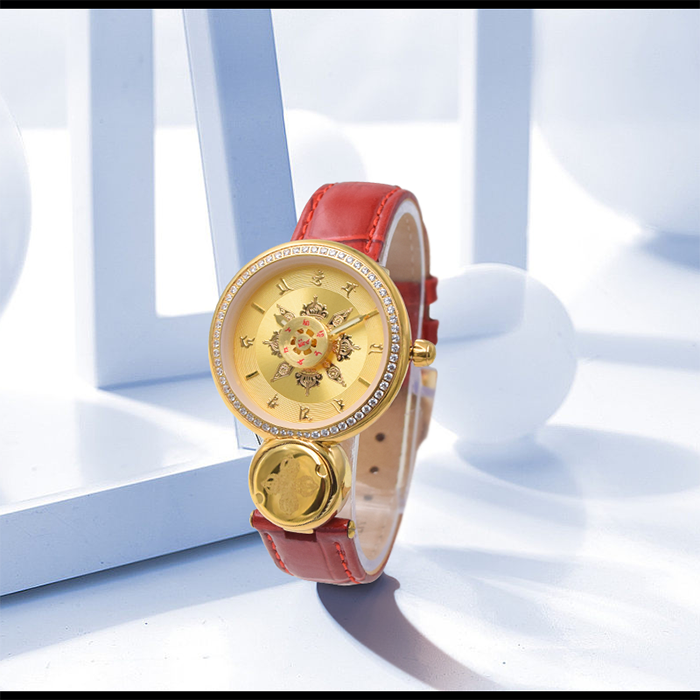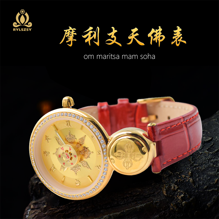 摩利支天意為“光”、“陽焰”,據藏傳佛教說是隱身和消災的保護神。 摩利支天具有極大的威力。此款為摩利支天轉經輪嘎烏盒手表 精密匠心:表盤內除了植入微型轉經輪,轉經輪處又雕刻吉祥咒語外,這一款表還設計了嘎烏盒在上面,小蓋子有配兩個,打開可以放香丸,甘露丸,經文等…… 鏤空花的蓋子還鑲嵌的彩色寶石,另一個贈送的蓋子可以替換刻著金剛杵,僅僅遇見就很有福氣了,如果有緣佩戴,更是增上吉祥!