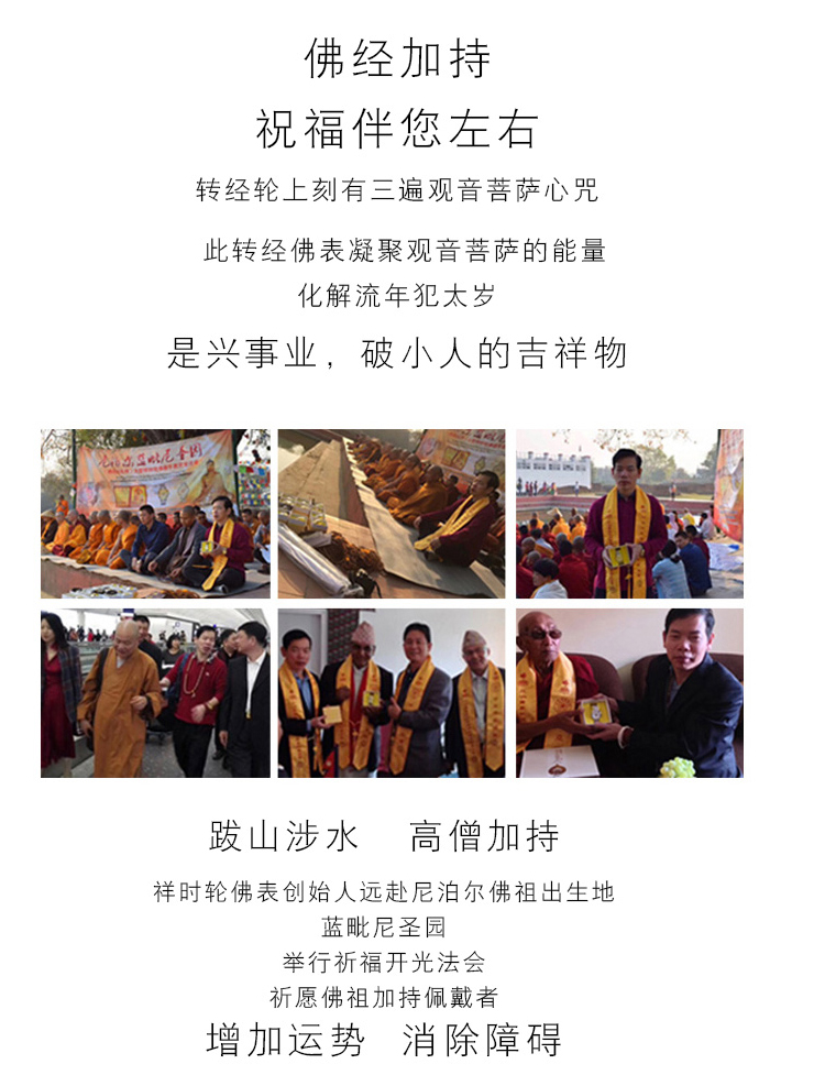 著于身、觸于手、藏于家可逢兇化吉,遇難呈祥;表芯無始無終轉動不息,威力無比;時光與佛法律動,分分秒秒佛佑相伴。一切所求,無不滿足。