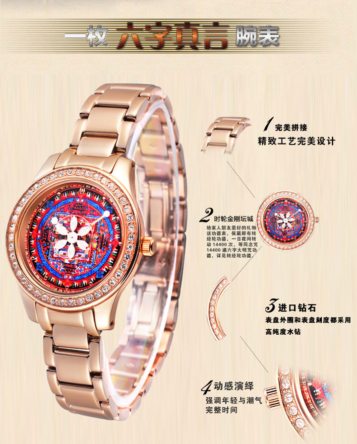 著于身、觸于手、藏于家可逢兇化吉,遇難呈祥;表芯無始無終轉動不息,威力無比;時光與佛法律動,分分秒秒佛佑相伴。一切所求,無不滿足。