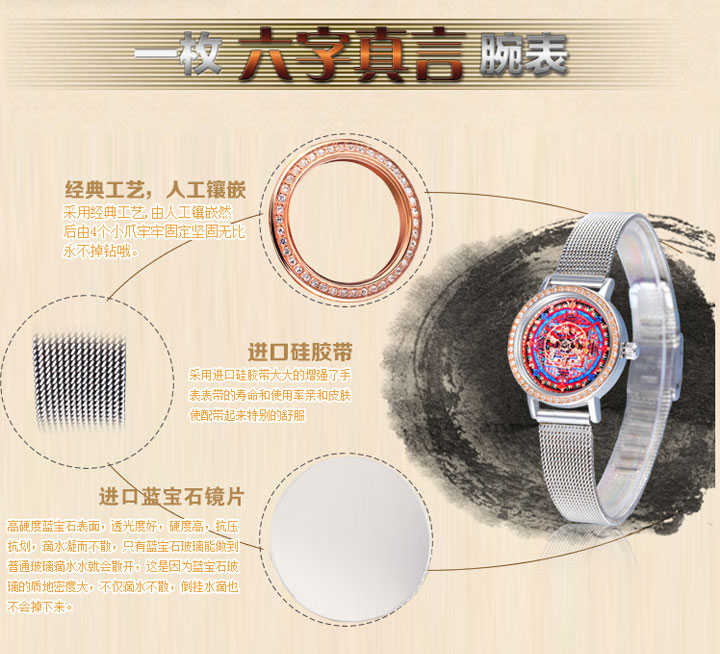 著于身、觸于手、藏于家可逢兇化吉,遇難呈祥;表芯無始無終轉動不息,威力無比;時光與佛法律動,分分秒秒佛佑相伴。一切所求,無不滿足。